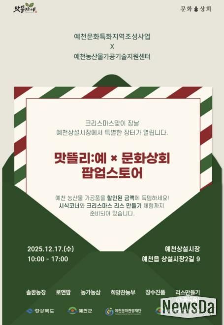 뉴스다 최광묵 기자 | 예천군과 예천문화관광재단은 17일, 예천상설시장 ‘문화상회’에서 크리스마스를 맞아 ‘문화상회 X 맛뜰리:예’ 프로그램을 개최한다.