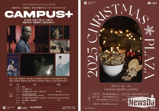 뉴스다 최광묵 기자 | 시흥시와 서울대학교 시흥캠퍼스가 오는 12월 17일부터 21일까지 특별 행사인 ‘2025 크리스마스 플라자(CHRISTMAS PLAZA)’를 개최한다. 올해 행사는 단 하루만 열리는 전야제 특별콘서트 ‘캠퍼스 플러스’를 중심으로, 국악과 클래식을 대표하는 최정상급 연주자들이 한자리에 모여 연말 분위기를 고조시킬 예정이다.