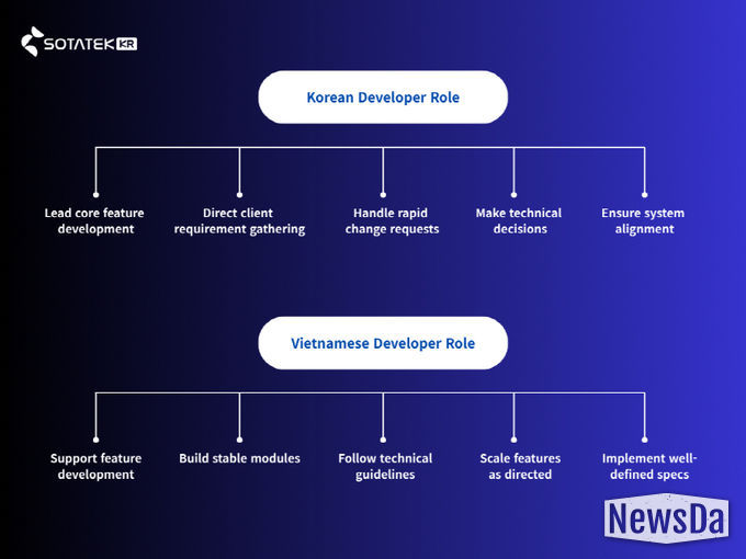 최근 국내 IT 업계에서는 한국 개발자와 베트남 개발자 간의 역할 분담이 더욱 명확해지는 추세다. 한국 개발자들은 핵심 기능 개발을 주도하며, 고객사로부터 요구사항을 직접 수집해 신속하게 대응하는 역할을 맡고 있다. 또한 기술적 의사결정을 수행하고 시스템의 전체적인 방향성을 관리하는 등 프로젝트의 전략적 중심축을 담당한다.