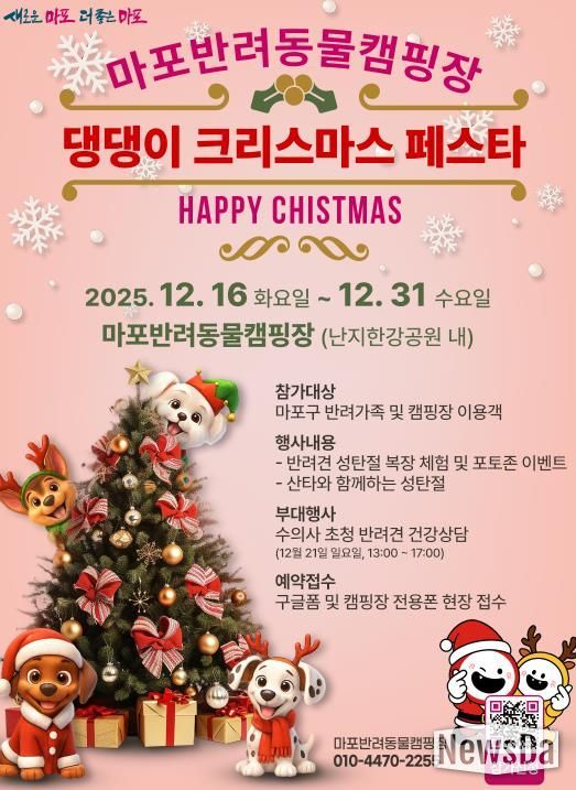 뉴스다 최광묵 기자 | 마포구는 연말을 맞아 2025년 12월 16일부터 12월 31일까지 난지한강공원 내 마포반려동물캠핑장에서 반려동물과 특별한 연말 추억을 만들 수 있는 ‘댕댕이 크리스마스 페스타’를 개최한다.