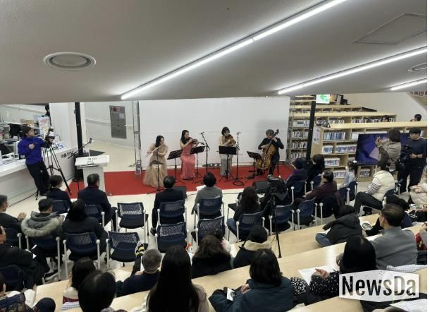 사회는 MBC 출신의 박혜진 아나운서가 맡았으며, 윤동주의 ‘서시’를 특유의 차분한 목소리로 낭독했다. 이어진 음악회 공연에는 바이올린 김지혜, 비올라 이수미, 첼로 어철민, 플루트 이지연으로 구성된 현악 4중주가 아름다운 공연을 선보였다.
