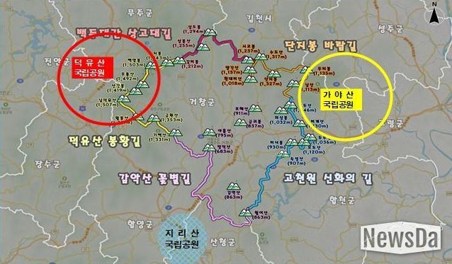 테마는 △단지봉 바람길(수행과 명상) △고천원 신화의 길(고천원 신화와 온천힐링) △감악산 꽃별길(합천호 전망과 별빛 트레킹) △덕유산 봉황길(1,500m급 고봉 도전) △백두대간 상고대길(상고대와 약초체험) 등으로 구성된다.