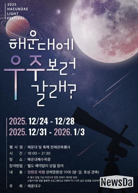 뉴스다 최광묵 기자 | 해운대구가 해운대빛축제 특별 이벤트 ‘우주 보러 갈래’를 12월 24~28일, 12월 31일~1월 3일에 운영한다.