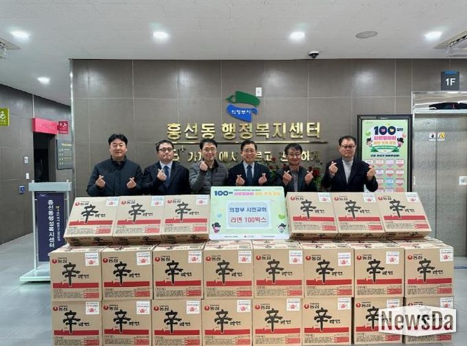 뉴스다 최광묵 기자 | 의정부시 흥선동행정복지센터는 12월 18일 의정부시민교회가 ‘100일간 사랑릴레이 배턴 잇기’에 동참해 라면 100상자를 기탁했다고 밝혔다.