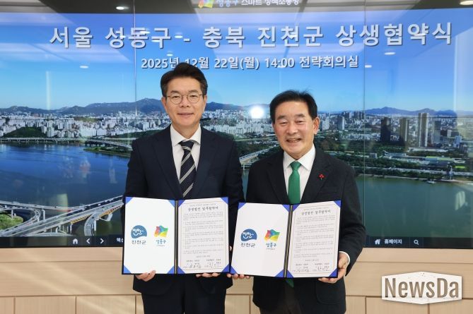 뉴스다 최광묵 기자 | 충북 진천군과 서울시 성동구는 22일 성동구청에서 상생협력 업무협약을 체결했다.