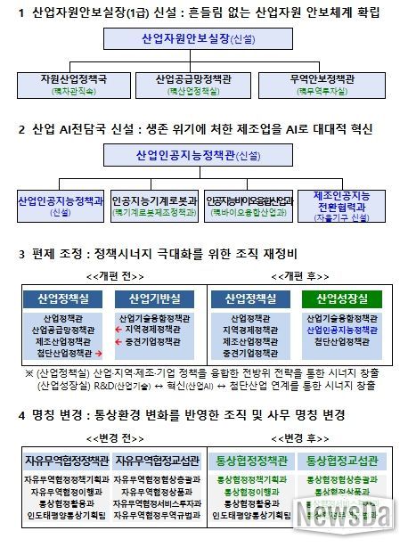 이번 조직개편은 국민주권정부 국정과제의 속도감 있는 이행을 위한 조직 기능 강화와 에너지기능 분리 이후 자원산업 재배치, 지역 성장 및 기업 활력 제고 등 정책시너지 창출을 위한 조직 재정비 차원에서 마련됐다.