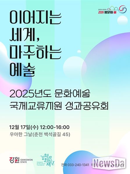 뉴스다 최광묵 기자 | 강원문화재단은 2025년도 문화예술 국제교류지원사업에 참여한 예술인들과 함께 12월 17일 춘천에서 성과공유회 '이어지는 세계, 마주하는 예술' 행사를 성황리에 마무리했다고 밝혔다.