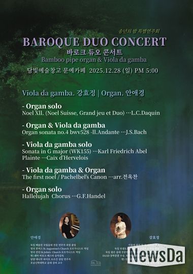 뉴스다 최광묵 기자 | 담양군문화재단은 오는 28일 오후 5시 담빛예술창고 문예카페에서 『2025 담빛예술창고 송년특별연주회 ‘바로크 듀오 콘서트’』를 진행한다고 밝혔다.