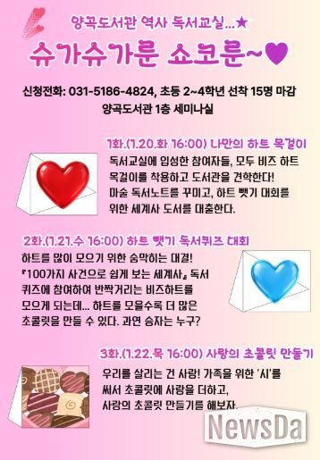 뉴스다 최광묵 기자 | 김포시는 2026년 1월 20일 오후 4시부터 6시까지 1층 세미나실에서 초등학교 2~4학년을 대상으로 한 역사 독서교실 '슈가슈가룬 쇼코룬'을 운영한다.