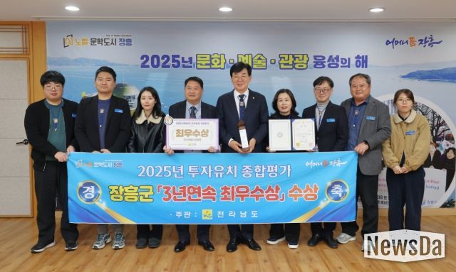 이번 평가는 전남도 22개 시·군을 대상으로 투자유치 실적, 유치 여건 조성, 일반 행정 등의 실적을 평가해 선정했으며 장흥군은 ‘2023년, 2024년 최우수상’에 이어 3년 연속 수상의 영예를 안았다.