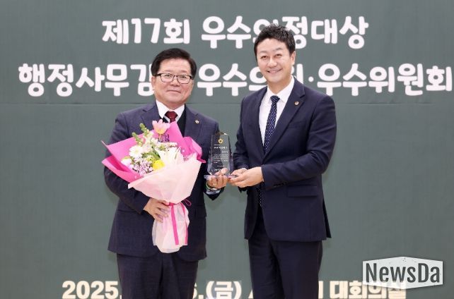 뉴스다 최광묵 기자 | 경기도의회 건설교통위원회 허원 위원장(국민의힘, 이천2)은 26일 경기도의회 대회의실에서 열린 ‘2025년 경기도의회 시상식’에서 대한민국시도의회의장협의회가 수여하는 ‘제17회 우수의정대상’을 수상했다.