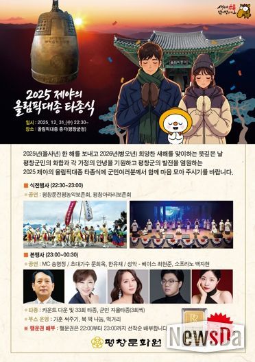 뉴스다 최광묵 기자 | 평창문화원은 다가오는 12월 31일 22시 30분부터 2025년 을사년을 마무리하고 희망찬 2026년 병오년 새해를 기원하는 2025년 제야의 올림픽대종 타종행사를 개최한다.