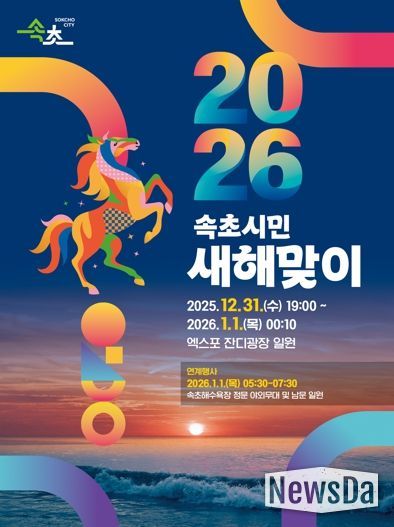 뉴스다 최광묵 기자 | 속초시가 병오년 ‘붉은 말의 해’를 맞아 12월 31일(수) 저녁 7시부터 엑스포 잔디광장 일원에서 ‘2026 속초시민 새해맞이 행사’를 개최한다. 다채로운 프로그램이 이어지며 시민의 안녕과 희망찬 새해 출발을 기원하는 화합의 시간이 될 전망이다.