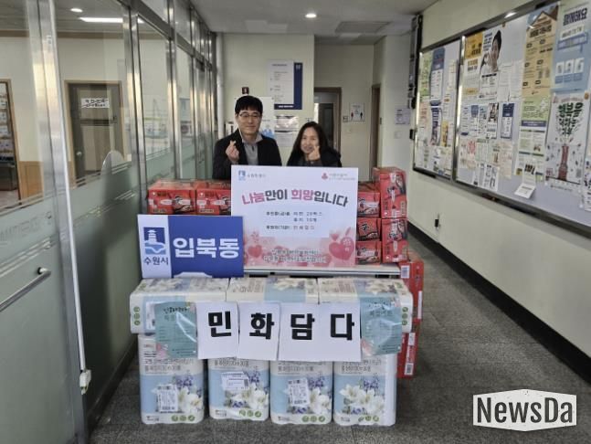 뉴스다 최광묵 기자 | 지난 26일, 당수동 소재 ‘민화담다’는 입북동 행정복지센터를 방문해 라면 20박스, 휴지 10개를 전달했다.