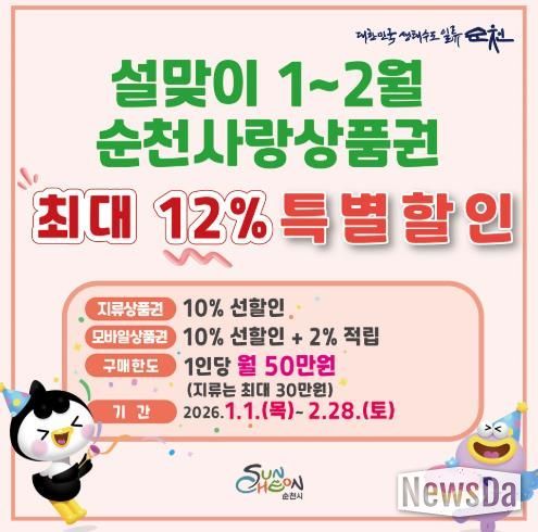 뉴스다 최광묵 기자 | 순천시가 새해와 설 명절을 맞아 2026년 1월부터 2월까지 두 달간 순천사랑상품권 할인 행사를 추진해 지역 소비 촉진에 나선다고 밝혔다.