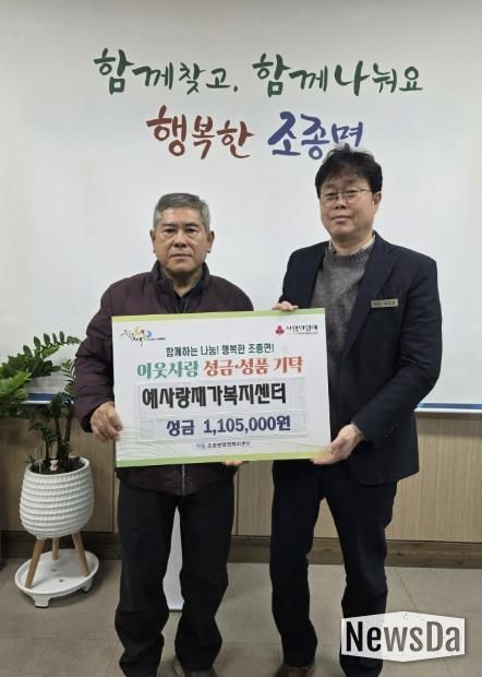 임진섭 조종면장은 “지역 복지 현장에서 묵묵히 헌신해 온 예사랑재가복지센터가 연말 나눔에도 앞장서 주셔서 감사드린다”며 “전달된 성금은 도움이 절실한 가구에 소중히 전달해 실질적인 지원이 이루어질 수 있도록 하겠다”고 전했다.