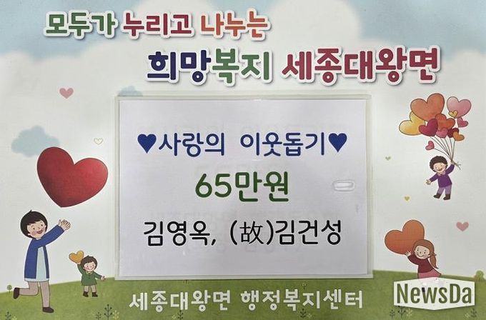 뉴스다 최광묵 기자 | 지난 29일 세종대왕면 구양리에 거주하는 김영옥, (故)김건성께서 관내 어려운 이웃을 위한 성금 65만원을 세종대왕면 지역사회보장협의체에 기탁했다.