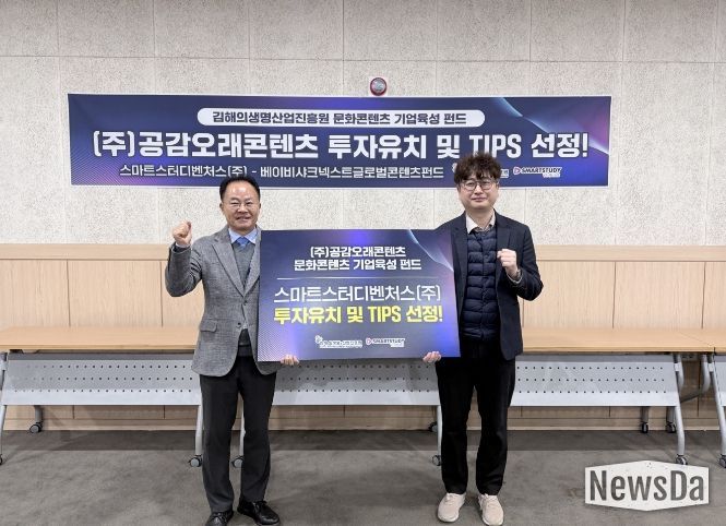 뉴스다 최광묵 기자 | 김해시와 김해의생명·산업진흥원은 지역 콘텐츠 기업 ㈜공감오래콘텐츠(대표 윤민형)가 글로벌 콘텐츠 IP전문 투자사인 스마트스터디벤처스(대표 이현송)로부터 투자유치에 성공하고, 중소벤처기업부 팁스(TIPS) 프로그램에 연이어 선정되는 성과를 거뒀다고 30일 밝혔다.