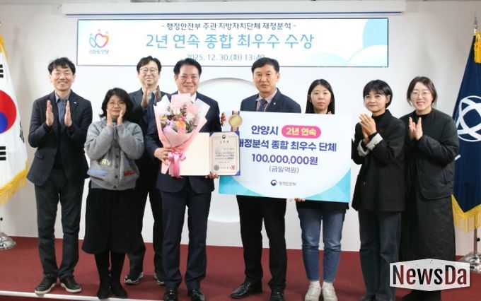 뉴스다 최광묵 기자 | 안양시는 행정안전부에서 실시한‘2025년(2024 회계연도) 지방재정분석’에서 종합점수 ‘가’등급을 받아 2년 연속‘종합 최우수’지자체로 선정됐다.