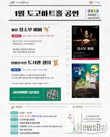 뉴스다 최광묵 기자 | 아산문화재단(대표이사 유성녀)이 운영하는 도고아트홀이 2026년 1월, 주말 상시 공연과 전시를 통해 새해 시민들의 문화 일상화를 이어간다. 이번 프로그램은 가족 단위 관람객과 어린이를 중심으로 공연과 전시를 함께 즐길 수 있도록 구성돼 있어, 새해 첫 달부터 풍성한 문화 향유 기회를 제공한다.