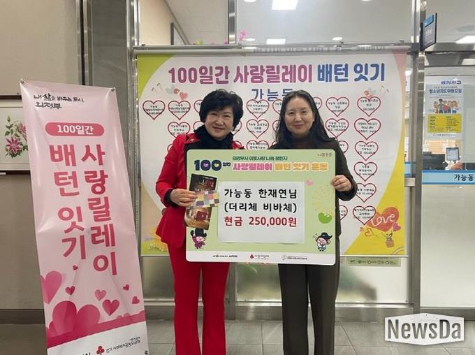 뉴스다 최광묵 기자 | 의정부시 가능동주민센터는 12월 29일 더리체 비바체가 관내 어려운 이웃을 돕기 위해 성금 25만 원을 기탁하며 ‘100일간 사랑릴레이 배턴 잇기’에 동참했다고 밝혔다.