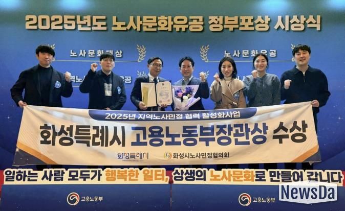 뉴스다 최광묵 기자 | 화성특례시는 지난 30일 고용노동부 주관으로 열린 '2025년 노사문화유공 정부포상 시상식’에서 ‘지역노사민정 협력 유공’단체부문 고용노동부장관 표창을 수상했다고 31일 밝혔다.