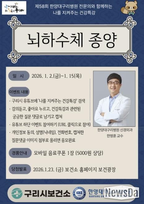 새해 첫 건강특강의 주제는 ‘뇌하수체 종양’으로, 한양대학교 구리병원 신경외과 한명훈 교수가 강의를 맡아 구리시 공식 유튜브 채널 ‘구리비전’을 통해 시민들에게 전달될 예정이다.