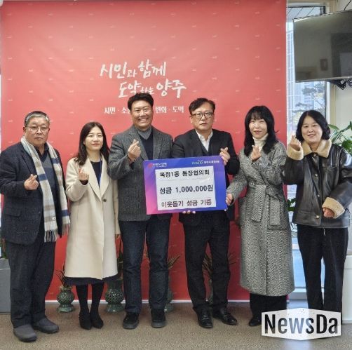 뉴스다 최광묵 기자 | 옥정1동 통장협의회가 31일 지역 내 어려운 이웃을 돕기 위해 ‘이웃돕기 성금 100만 원’을 옥정1동에 기부했다. 기부금은 관내 취약계층과 복지 사각지대 가정 지원을 위해 사용될 예정이다.