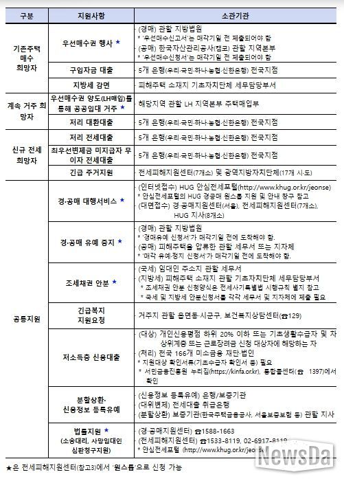 전세사기로 어려움을 겪고 있는 임차인은 거주지 관할 시・도에 피해자 결정 신청을 할 수 있고, 위원회 의결을 거쳐 피해자로 결정된 자는 주택도시보증공사(HUG) 전세피해지원센터(대면・유선) 및 지사(대면)를 통해 지원대책에 대한 자세한 안내를 받을 수 있다