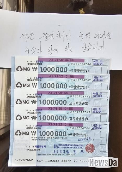 청평면의 ‘얼굴 없는 천사’로 알려진 이 기부자는 2016년부터 현재까지 10년째 익명 기부를 이어오며 매년 빠짐없이 성금을 전달해 오고 있다. 익명의 기부자가 전달한 봉투에는 “작은 물질이지만 지역의 어려운 이웃과 함께 하고 싶습니다.”라는 내용과 함께 100만 원권 수표 5장이 담겨 있었다.