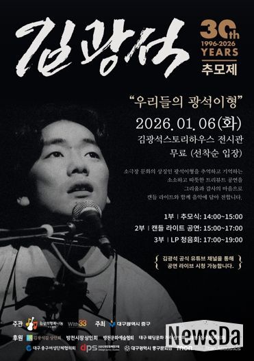 뉴스다 최광묵 기자 | 대구 중구는 1월 6일 오후 2시 한국 대중음악사에 큰 발자취를 남긴 故 김광석의 30주기를 맞아 추모행사를 개최한다.