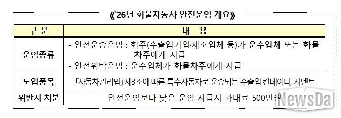 뉴스다 최광묵 기자 | 국토교통부는 ’26년에 적용되는 화물자동차 안전운임을 1월 중에 확정하여 고시할 예정이라고 밝혔다.