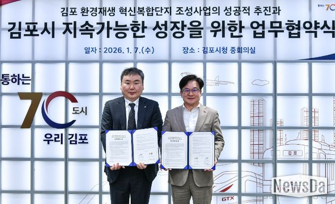 뉴스다 최광묵 기자 | 김포시가 7일 한국수자원공사와 김포 환경재생 혁신복합단지 조성사업의 성공적 추진과 김포시의 지속가능한 성장을 위한 업무협약을 체결했다.