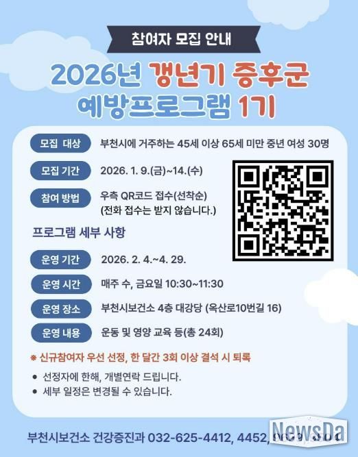 송정원 부천시보건소장은 “갱년기로 인한 신체적 변화와 정서적 어려움을 겪고 있는 중년 여성들이 이번 프로그램을 통해 건강한 일상을 회복하는 데 도움이 되길 바란다”며 “적극적인 참여를 기대한다”고 말했다.