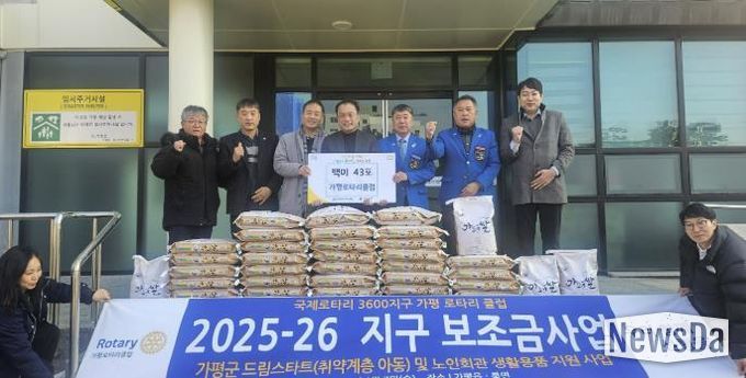 뉴스다 최광묵 기자 | 가평로타리클럽은 최근 가평읍 행정복지센터를 방문해 130만원 상당의 백미 43포대를 기탁했다. 이번 성품 기탁은 병오년 새해를 의미 있는 나눔으로 시작하자는 회원들의 뜻을 모아 마련됐다.