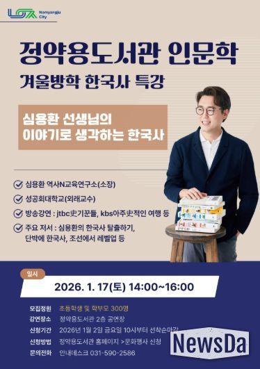 뉴스다 최광묵 기자 | 남양주시는 오는 17일 오후 2시 정약용도서관 2층 공연장에서 겨울방학 인문학 특강 ‘이야기로 생각하는 한국사’를 개최한다.