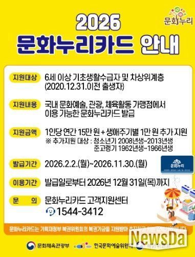 뉴스다 최광묵 기자 | 정부 정책에 따라 2026년부터 통합문화이용권(문화누리카드)과 청년문화예술패스 제도가 개편된다. 이에 따라 양주시는 개편 기준에 맞춰 지역대상자를 대상으로 해당 사업을 확대 시행한다고 밝혔다.