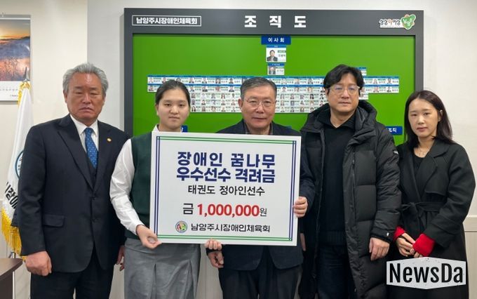 이날 행사에서 손기남 남양주시장애인체육회 수석부회장이 장애인태권도 국가대표 정아인 선수에게 직접 격려금을 전달했다. 전달식에는 윤성한 남양주시장애인태권도협회장을 비롯한 관계자와 선수 가족이 함께 참석해 의미를 더했다.