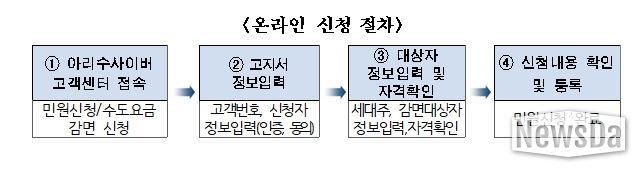신청방법은 방문신청 또는 온라인신청이 가능하다. 방문 신청은 1월 12일부터 감면받을 주소지 관할 동주민센터에서 우선 접수하며, 온라인 신청은 3월 3일부터 서울아리수본부 누리집 내 아리수 사이버고객센터에서 할 수 있다.