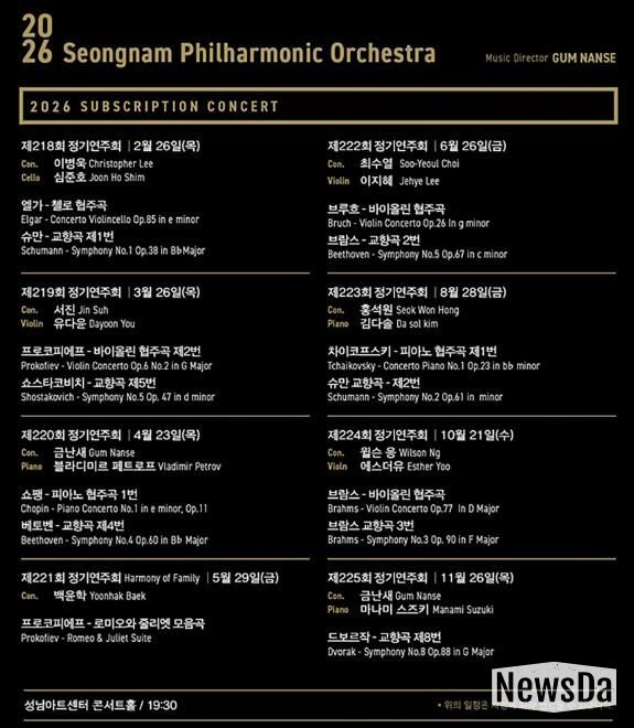 2026년 총 8회 정기공연 라인업을 확정하고, 1월 12일 오후 2시 시즌권을 놀(NOL) 티켓을 통해 오픈한다. 성남시향의 예술총감독 금난새 지휘자를 비롯하여 이병욱, 서진, 백윤학, 최수열, 홍석원, 윌슨 응의 지휘와 첼리스트 심준호, 바이올리니스트 유다윤, 피아니스트 블라디미르 페트로프, 바이올리니스트 이지혜, 피아니스트 김다솔, 바이올리니스트 에스더유, 피아니스트 마나미 스즈키 등의 화려한 협연자를 초청하여 올해 최고의 정기연주회를 마련한다.