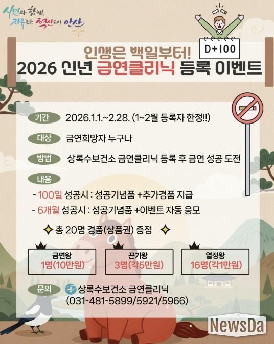 뉴스다 최광묵 기자 | 안산시 상록수보건소는 새해를 맞아 1~2월 금연 클리닉 신규 등록자를 대상으로 기념품 및 추첨 경품을 제공하는 이벤트를 진행한다고 12일 밝혔다.