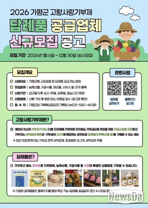 가평군은 1월 6일부터 12월 30일까지 고향사랑기부제 답례품 공급업체를 상시 모집한다고 12일 밝혔다. 이번 모집은 기부자에게는 다양하고 품질 높은 답례품을 제공하고, 지역 농가와 기업에는 새로운 판로를 제공해 지역경제 활성화로 이어지도록 하기 위한 취지다.