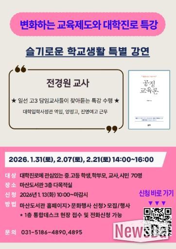 뉴스다 최광묵 기자 | 김포시 마산도서관이 1월 31일, 2월 7일, 2월 21일 2월 21일 3회에 걸쳐 오후 2시부터 4시까지 ‘변화하는 교육환경(슬기로운 학교생활)’에 관심이 있는 중고등학교 학부모, 교사, 학생 등 김포시민을 대상으로 특별강연을 운영한다.