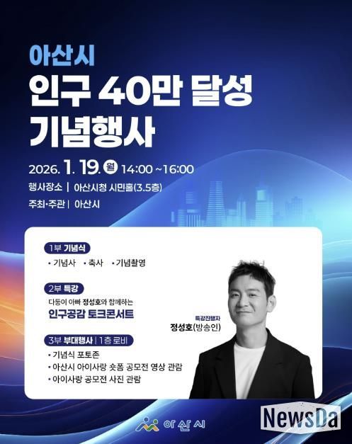 뉴스다 최광묵 기자 | 아산시는 2025년 12월 말 기준 인구 400,221명(외국인 포함)을 기록하며 인구 40만 명을 달성함에 따라, 이를 기념해 1월 19일 오후 2시 아산시청 시민홀에서 시민들과 함께하는 기념행사를 개최한다고 밝혔다.