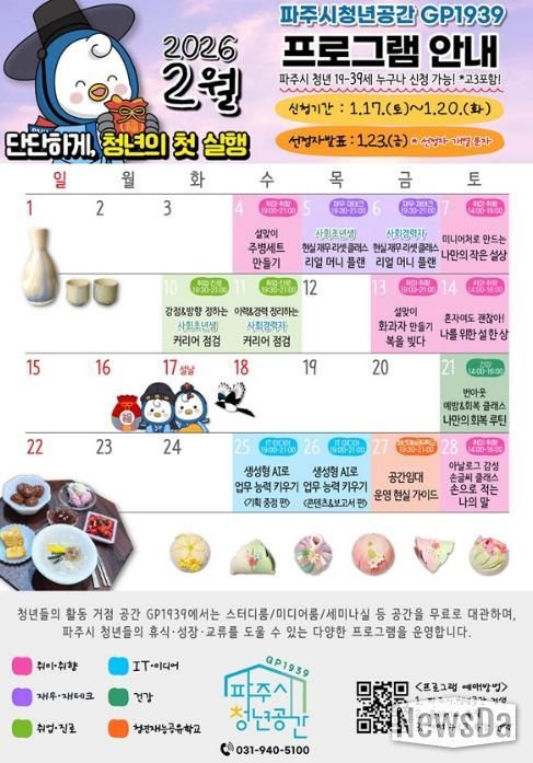 뉴스다 최광묵 기자 | 파주시청년공간 지피(GP)1939가 오는 2월 한 달간 청년을 위한 맞춤형 프로그램에 참여할 참여자를 모집한다.