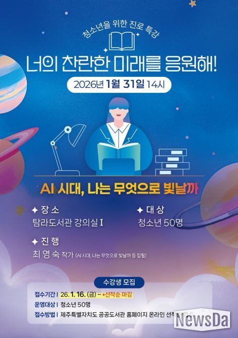 뉴스다 최광묵 기자 | 제주시 탐라도서관은 청소년이 자신의 삶과 진로 고민을 해소하고 진로 설계의 방향성을 설정할 수 있도록 돕는 특강 프로그램 ‘너의 찬란한 미래를 응원해’를 운영한다.