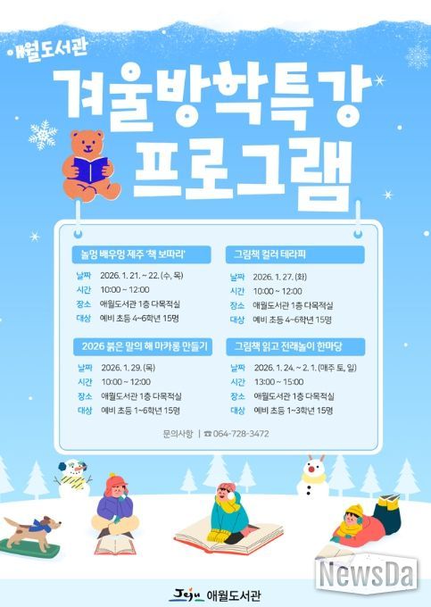뉴스다 최광묵 기자 | 제주시 애월도서관은 겨울방학을 맞아 어린이들이 책과 놀이, 체험 활동을 통해 즐겁게 배우고 독서에 대한 흥미와 창의력을 키울 수 있도록 ‘2026 애월도서관 겨울방학특강 프로그램’을 운영한다.