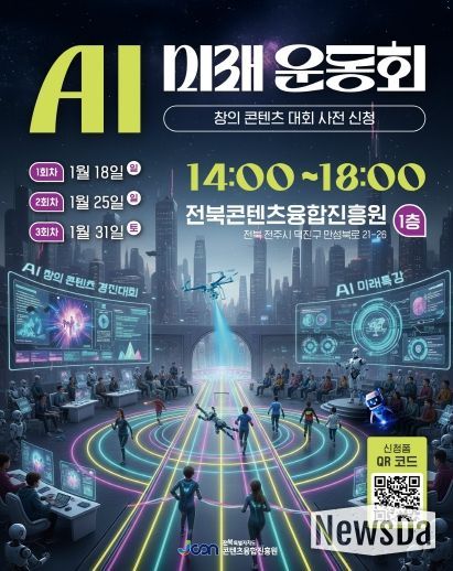 뉴스다 최광묵 기자 | 전북특별자치도가 주최하고 전북특별자치도콘텐츠융합진흥원이 주관하는‘AI 미래운동회 & 창의 콘텐츠 대회’가 오는 1월 18일, 25일, 31일 총 3회에 걸쳐 걸쳐 진흥원 1층에서 개최된다