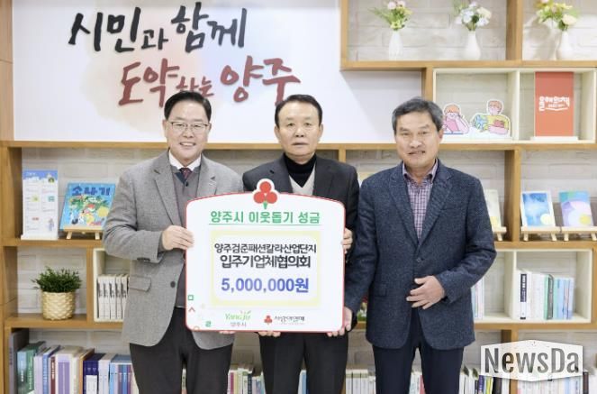 뉴스다 최광묵 기자 | 양주시가 지난 15일 시장실에서 양주검준패션칼라사업협동조합을 비롯한 관련 단체 및 기업으로부터 이웃돕기 성금과 성품을 기탁받았다고 밝혔다.