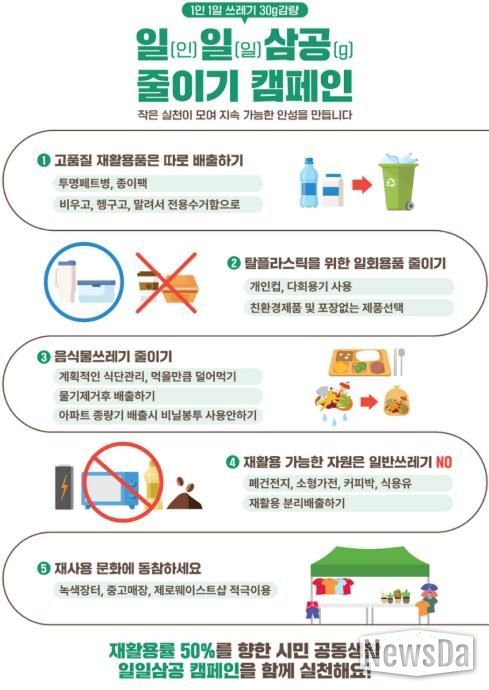 뉴스다 최광묵 기자 | 안성시는 시민의 자발적인 실천을 통해 재활용률을 높이고 생활쓰레기 발생량을 줄이기 위한 ‘1인 1일 쓰레기 30그램 줄이기(일일삼공) 캠페인’을 적극 추진하고 있다고 밝혔다.